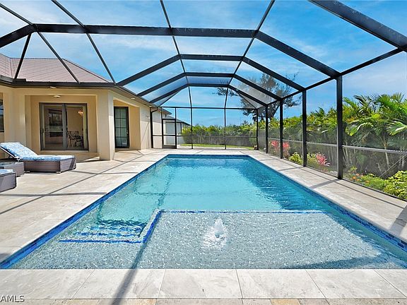 This stunning furnished custom home is situated on a triple lot with a fenced back yard, making it perfect for enjoying the western exposure sunsets. While outside, indulge in the salt water heated pool with a sun shelf ledge and bubbler surrounded by stunning stone pavers. Enjoy the total privacy provided by the wrap around Areca palm trees while leisurely lounging poolside. The oversized under truss lanai features an outdoor kitchen, pool shower and half bath. This house has all the bells and whistles with impact glass for security and noise reduction. Enjoy luxury living with features like soaring coffered ceilings, a metal roof and porcelain tiles. The home boasts quartz countertops, 42” walnut cabinetry, custom wood window casings and central vacuum system. You can relax in the owner's suite bathroom with multiple showerheads. This home is conveniently located near shopping, dining and other services. Don’t miss your opportunity to enjoy true Southwest Florida luxury! ***Seller would also consider annual rental and rent to own terms.****Agents: Please read confidentials.****