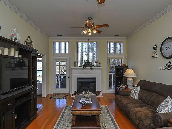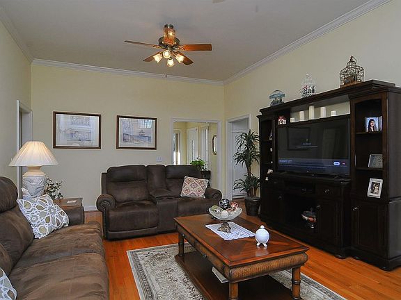 - Living Room: Fireplace, Floors-Hardwood, Molding, Books, Entertainment Center, Ceilings-High (over 9 Ft), Ceiling Fan