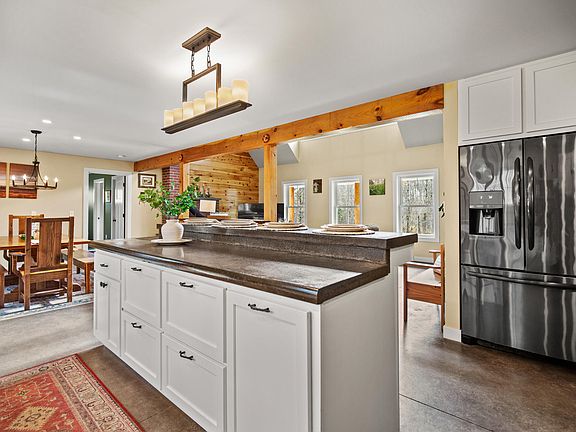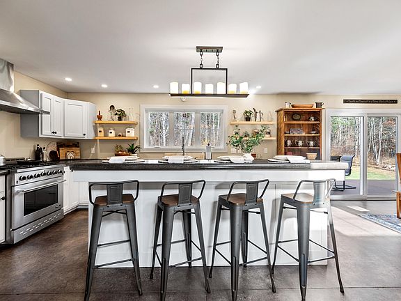 Perched on a private, peaceful expanse of land on a dead-end road, this North Yarmouth property is a truly special spot. Inside, rustic radiance prevails, with soaring ceilings, huge windows, gorgeous concrete floors and an airy open concept layout. You'll adore the kitchen's cement countertops, stainless steel appliances (including a vented hood fan!), gas stove and pantry. The seamlessly situated dining area's nature views & direct access to the deck will have you lingering over lunch. Breathtaking, spacious and serene, the living room will be your go-to for curling up with a book and watching the flakes fly this winter. The main floor primary ensuite bedroom is a sweet retreat, complete with a walk-in closet & beautiful tiled bathroom. The mudroom/laundry room is ready to make daily chores a breeze. A half bath rounds out the first floor. Upstairs, three bedrooms mean there's plenty of room for sleep. The family room is your go-to for game nights or catching a good movie. Need a soothing soak before bed? The second floor's full bath is ready to serve. The 2-car garage features a utility room plus space for a home gym. Outside, a wrap-around porch and hot tub offer up a respite that will always have you hustling home. 80 acres of public land surround the property, and two great golf courses are within the span of 2 miles. Take your pick from downtown Yarmouth or downtown Cumberland for gas, groceries and delicious dinners out - both are a quick 7-minute dash away in the car. It's easy to bloom where you're planted here, where parks are plentiful, community is cherished and amenities are abundant. Your haven awaits!