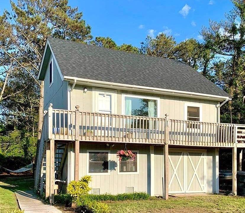 This second home (never a rental), situated on a large (15,000 sg ft) lot and located on a quiet cul-de-sac in a year-round neighborhood, is offered fully furnished. The HVAC system was replaced in September 2016 and the newly reconstructed decks and pilings were completed in June 2016!! The ground level consists of a garage, very large workshop, and a large utility room. The kitchen and full bath have been recently remodeled!