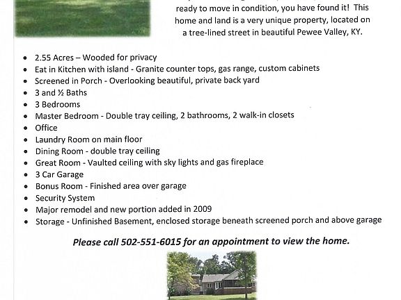502 551 6015***PRICE REDUCED***Don't miss an opportunity to own one of the best constructed and most beautiful homes in Pee Wee Valley! This remarkably well cared for split floor plan ranch was re constructed in 2009 with updated NEW WINDOWS, DOORS, PLUMBING, ELECTRICAL AND ROOF! It has amenities galore! The open Kitchen includes, *GRANITE* *CUSTOM CABINETS* *TRAVERTINE* *DOUBLE OVENS* *GAS COOK TOP*. There are architectural details throughout the entire home. Custom features, such as TWO MASTER BATHROOMS and TWO MASTER WALK IN CLOSETS. The SCREENED BACK PORCH is where you will spend your spare time overlooking the gorgeous 2.55 acres of flat, wooded land. This home will sell quickly, schedule your showing TODAY! It has a 3 car garage with finished bonus room over garage. Major remodel and new portion added in 2009. REALTORS WELCOME