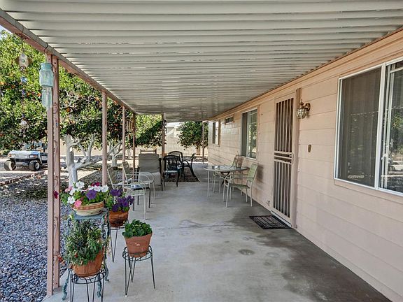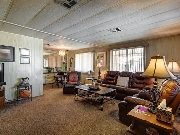 Well taken care of 2 bedroom, 2 bathroom mobile home in friendly and quiet 55+ community. Land is owned, not rented. Large 2 car covered carport. Home is very roomy inside, and features dining, living, and family room areas. Kitchen has non-laminate counters with all white appliances and built-in, water softener and water heater 2019. Inside laundry. Large master suite has a full size bathroom. Backyard has 2 patios, one covered patio and mature fruit trees. Many recent updates. 2015: laminate flooring and painted throughout, new AC and furnace, 2016: new sidewalk on side of house, 2017: roof coated, concrete patio, new weather efficient windows. Great areas for socializing in the Community pool, clubhouse, Get ready to move, your home sweet home awaits you!