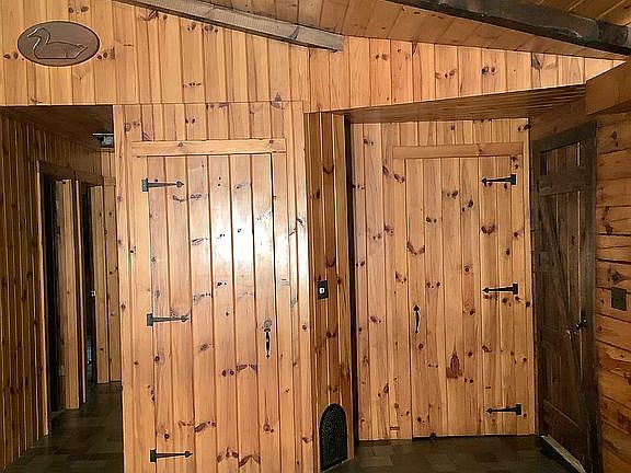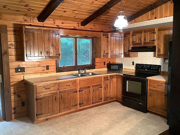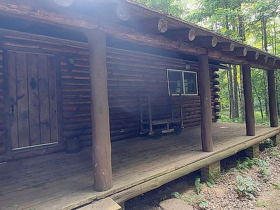 The log cabin has a first floor consisting of the following; a 23’x12 living area with a corner stone fireplace; 10’x11’ Kitchen, 10’11’ Dining area with sliding glass door to rear deck (12’x20’), a master bedroom 15’x11 with closet, a second bedroom 17’x10’ with closet. Full bath is 11’x7’. The front door opens to an 8’x44’ full house length covered porch. The full basement has two sides, one finished 22’x11’ family room with gas stove and sliding glass door to slate patio and an 8’19 half bath/laundry room combination with closet. The other side is a Workshop and storage with a sliding glass door and man door access to the rear yard. A working tool shed about 75’ from the house.
