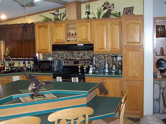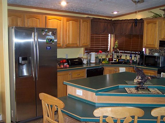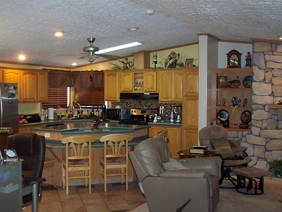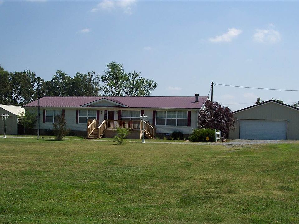Must see this open floor plan with huge kitchen and wrap around island bar, stone fireplace in great room. Lot lines on rear and left side are center of heat and air and bar. Pool house that needs to be completed. Above ground pool with surrounding deck. Another shed on property has lean-to. Metal roof installed in approximately 2009.