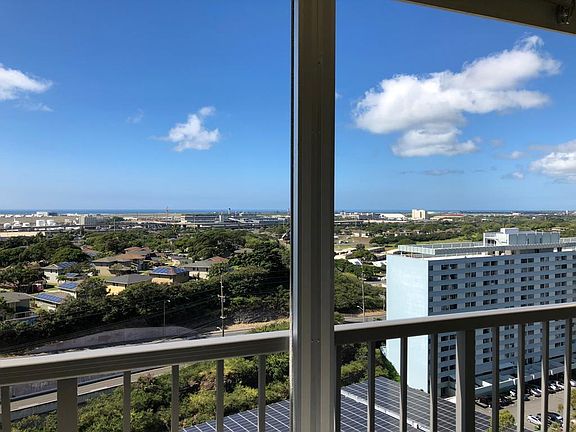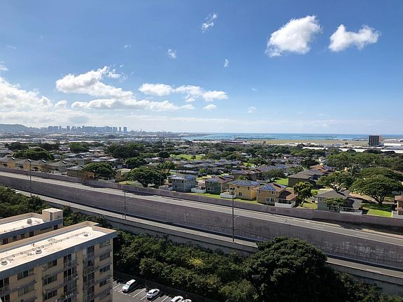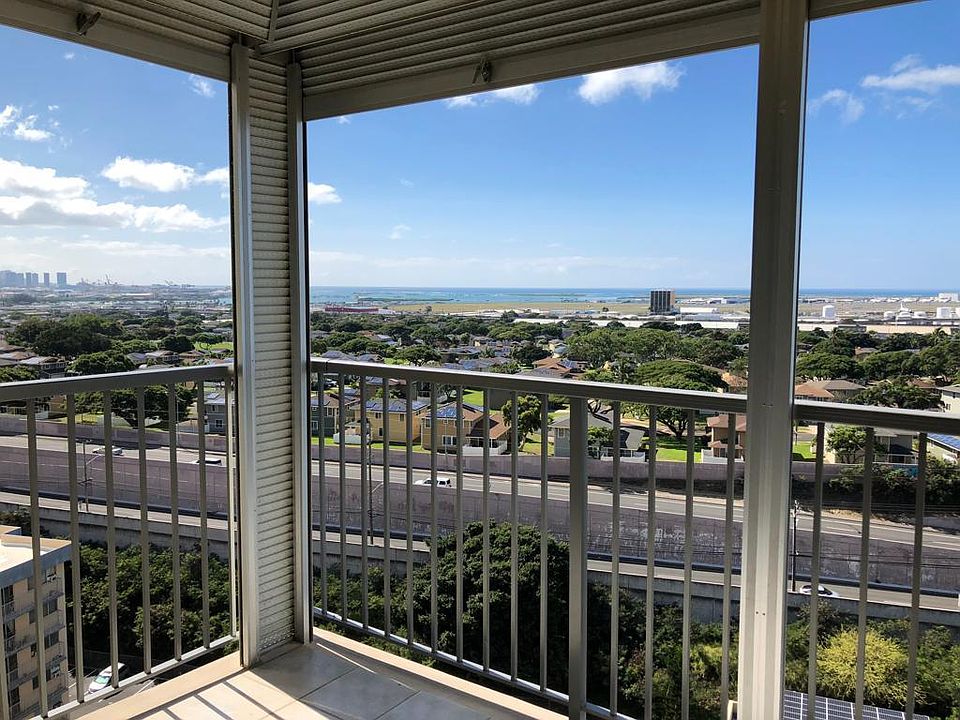 Available August... this high floor unit, with a lanai, is great for you to enjoy the panoramic view of the Ocean, Airport, Diamond Head, City Lights... and you can also enjoy spectacular fireworks during holidays... Conveniently located, with easy access to Bus Stops, Freeways, Airport, Tripler Hospital, JBPHH, Ft Shafter and other major military bases, shopping centers and more .... Community laundry is on the same floor for your convenience. This 2 bedrooms, 2 baths, and 1 covered parking stall unit is located on the 19th floor. The kitchen has granite counter top. It also comes with a big stainless steel refrigerator. AC Window units are in both bedrooms and living room. Amenities include BBQ area, Children's Playground, Community Laundry on each floor, Pool, and Security Guard and Resident manager. One PET is welcome with pet security deposit of $300. There is a dog park for your dog to relax. Rent is $1,850 and Security Deposit is $1,850. Rent includes water, hot water and sewer only. Electricity is not included. Application fee is $25.00 per adult applicant. Please text Denise for showing info. Owner pays for water, sewer and hot water only. Tenant pays electricity. NO smoking please. Pet with pet deposit of $300