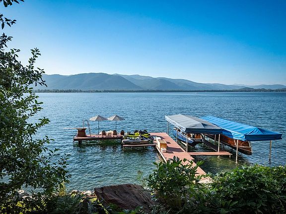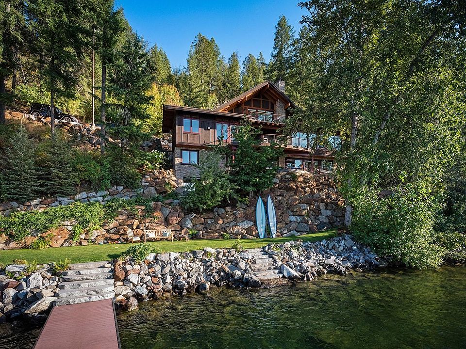 First time ever offered! Contemporary home with 160' of private waterfront on Lake Pend Oreille. There's room for the whole gang in this stunning 5000 +/- square foot 5 bed 6 bath residence boasting a theater room, large den/game room with wet bar, 4 fireplaces, main floor outdoor dining area, lower level patio with sunken hot tub, upper level studio with private balconies, and water views from almost every room in the house. Outside a grass covered pathway leads you down to the lawn at the water's edge where you'll find an incredible dock system with a diving board and room for all the toys, plus granite stone steps into the pristine crystal clear waters of the lake.