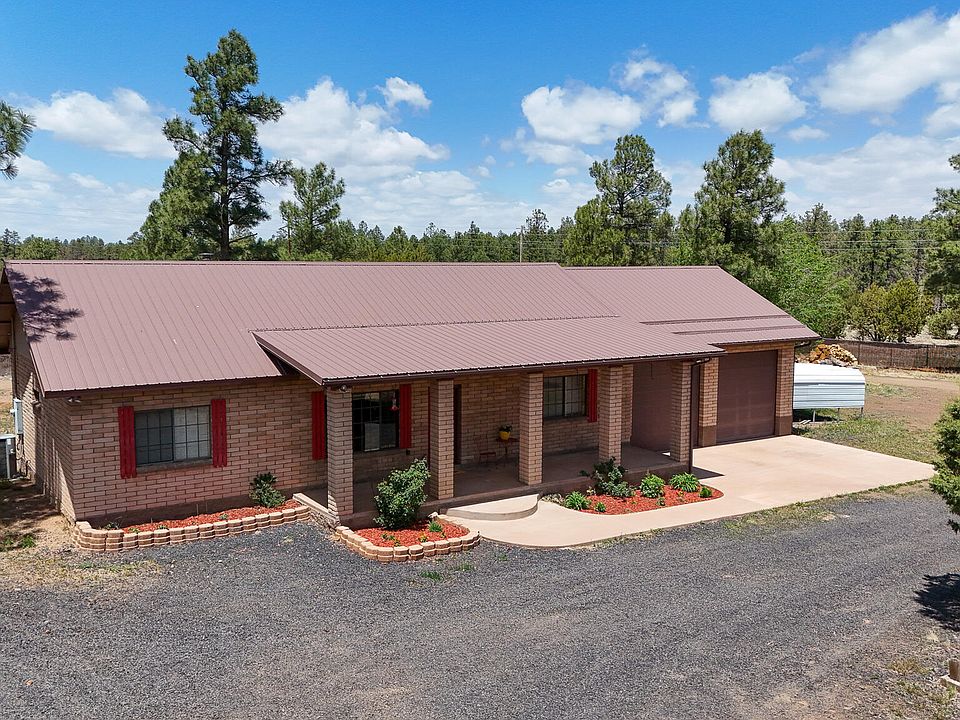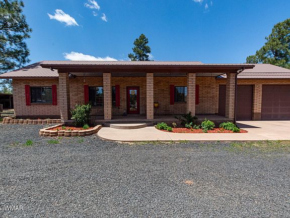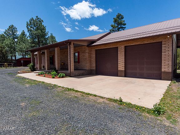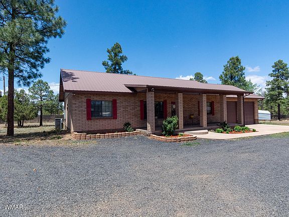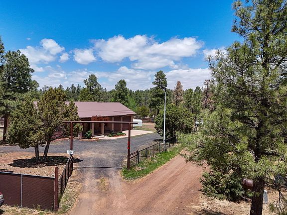 Tucked away in the majestic tall pines of Arizona, this well-built 3-bedroom, 2-bath home sits on a full acre that directly backs to national forest, offering unparalleled privacy, views, and access to outdoor adventure right from your backyard. Constructed with durability, efficiency and low maintenance in mind, the home features solid block construction with wood-framed interior walls, providing excellent insulation for year-round comfort. The split floor plan offers privacy and functionality, while the vaulted ceilings create a spacious, airy feel throughout the main living areas. The oversized 2-car garage easily accommodates two full-sized trucks with room to spare for storage or a workshop. A durable metal roof not only adds to the home's longevity but also reduces fire risk, a key feature in forested settings. The fully fenced property is enclosed with custom-welded piping, combining security and rugged charm. Multiple outbuildings offer ample space to park ATVs, store equipment, or house recreational gear out of the elements. Whether you're looking for a full-time residence, mountain getaway, or the ideal basecamp for exploring Arizona's high country, this property delivers the best of both comfort and wilderness living.