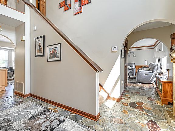 Step into elegance with this beautifully updated colonial. A slate tile entry welcomes you into the impressive two-story foyer setting the tone for the refined details throughout. The main level boasts luxurious vinyl flooring, leading to a warm and inviting family room featuring a charming brick gas fireplace. Entertain in the spacious dining room. The living room would make for a great home office. The heart of the home is the custom-updated kitchen with granite countertops, tile backsplash, and center island. A 1st FL sunroom offers a cozy retreat. Upstairs, the expansive owner’s suite is a true sanctuary, showcasing an incredible spa-like bath with a stunning shower, body jets, and modern fixtures. The finished basement is perfect for a home theater or gym. Outdoor entertaining is a dream with a fully equipped covered patio with bar, built-in grill, fireplace, ice maker, and even a pizza oven. Built in 3rd garage storage bay and shed. Nature Stone garage and stairs outside.