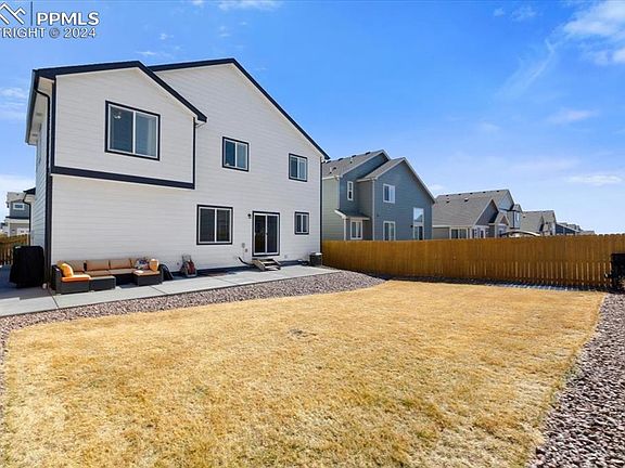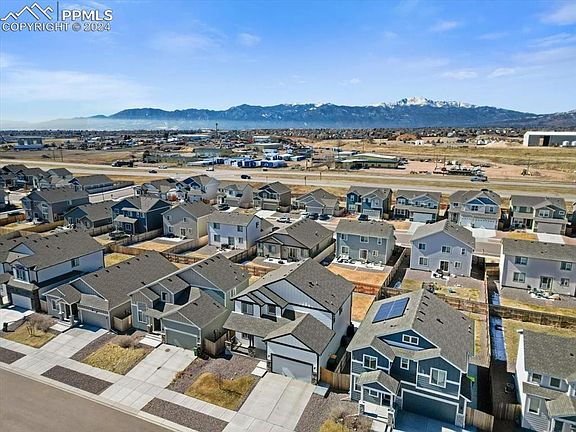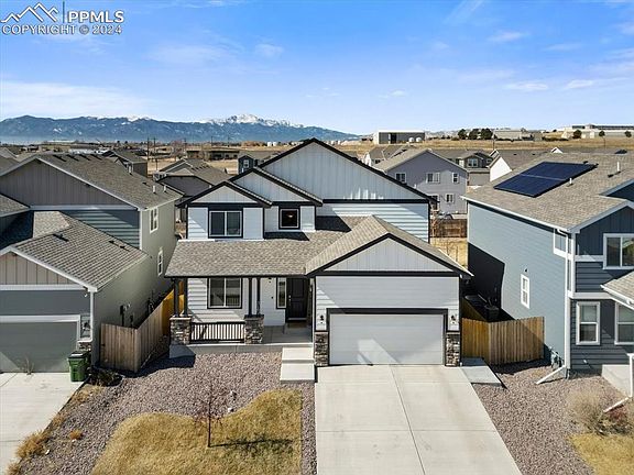Pristine/ 3 car garage tandem, 4Bedroom + loft, that can be turned into a 5thbedroom, & 3.5Bath, has true pride of ownership w/ fabulous Mtn & Pikes Peak views from the rear! Located Near ALL Bases. Farmhouse style exterior and front porch to enjoy the Colorado sunshine and active neighborhood. Central air/heat for year-round comfort. Beautiful hardwood floors through the Entry, Dining Rm, & Kitchen. Window blinds, rods, & attractive drapes throughout! The Dining Rm has front yard views & access to the Kitchen. The Bright Kitchen features a pantry, counter island, espresso cabinets w/ quartz countertops. SS appl incl a smooth top range oven, built-in microwave, dishwasher, & French door refrigerator. Walk out to the oversized backyard patio. The Kitchen overlooks the Living Rm which has neutral carpet & a backyard view. There is a Powder Bathroom for guests on main level. The UL has 3BRs, 2BAs, w/a loft & Laundry Rm w/washer & dryer that stays. The Primary BR retreat includes neutral carpet & an adjoining 5pc Bathroom w/dual sink vanity, Large tub, tiled shower, & X-large walk-in closet. 2 more BRs and loft share a Full Bathroom w/ vanity & tub shower. Finished Basement designed for flexible use depending on your family's needs w/spacious 4th BR, Shower Bathroom w vanity, mirror, & tiled shower. Extras incl a RING doorbell, whole house humidifier, sump pump, & there is 6 years left on the builder’s 2-10 structural warranty. There is a finished 3-car tandem garage that is HEATED w/ a door opener, & TESLA charger. Fully fenced, level grass backyard offers Wi-Fi auto sprinklers & an extended concrete patio for outdoor relaxation, dining, & fun. Ideally located and close to top rated schools, shopping, well-maintained parks & walking trails. It's also just a 10 min drive to Peterson Space Force Base and all other bases are near by. Come make this amazing move-in ready home your own & you will enjoy creating memories in this active neighborhood.