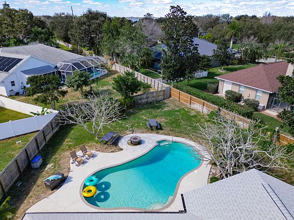This beautiful 4 bedroom 2.5 bath pool home is located in a quiet cul-de-sac in desirable South Tropical Cove, in a great school district. 0.34 acre lot has a private, fenced back yard with shading and space for your RV and boat. The Open floor plan has high ceilings, separate living, dining and family rooms. The spacious kitchen is perfect for entertaining, offers ample cabinets, island, SS Appliances, eat-in area and a walk-in pantry. It connects to a large family room which overlooks the expansive lanai and the freeform pool. The Master suite is located on the first floor with an elegant tray ceiling, and his/ hers closets. The Mbath has large jetted garden tub, separate shower, and double sinks. Tiled floor throughout ground floor. 3 additional bedrooms located upstairs all have large closets. It has a laundry room, 2 car garage. Roof 2019, Air-conditioner and Water Heater 2017, Pool Pump 2022. With your personal touch, this home will become a Florida Oasis for your family and friends. Short drive to beaches, schools, shopping, dining, Port Canaveral, Cruise Ships, and Kennedy Space Center.