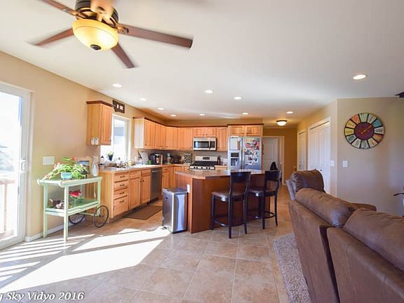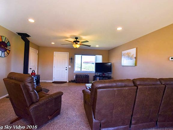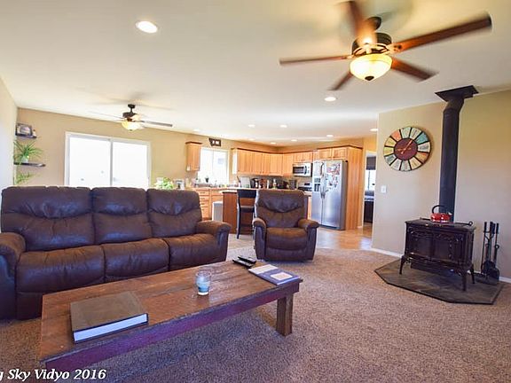 Like New Open floor plan living/dining/kitchen. LR has wood stove/ceiling fan. Master suite on west end has ceilingfan/master bath/walk-in closet/shower/tub. East end has 2 bedrooms and bath. Full walk-out basement, Finished 2 car garage with a 100 AMP sub panel to the 7500 W ceiling furnace and well lite (4-8' T-5 florescent fixtures), well insulated (R-30 ceiling & core bond in walls. Property is fully fenced and gated 1.87 acres which is plenty of room for the dogs.