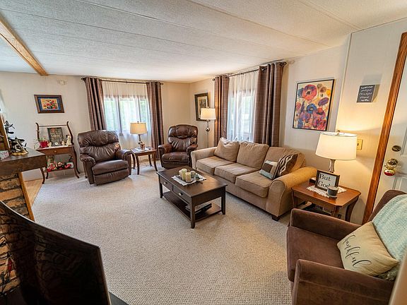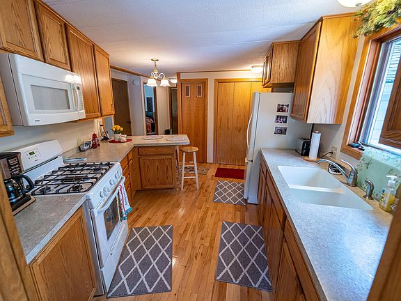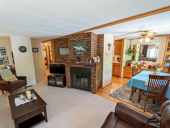 Well cared for manufactured home with a stick built addition on a 1.36 acre lot with 4BR/2BA. Jacuzzi in master suite. 2 stall detached garage with additional storage space. Kitchen remodeled in 2016. Beautiful maple floors in kitchen & dining. Great ambience with a Wilkening gas fireplace in family room. New roof on home in 2019 and new roof on garage in 2009. Paved drive and beautiful pine trees in yard. Two nice sized decks for your outdoor enjoyment. All new vinyl siding since owners purchased, water heater has been replaced as well as new pump for the well.
