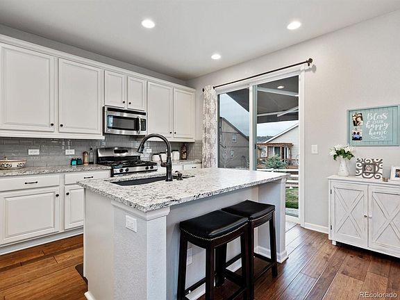 Beautifully upgraded ranch is move in ready on a cul-de-sac lot! Popular Alcott model boasts 3 bedrooms plus a study on the main floor and a full unfinished basement with room to expand! Welcome inside to engineered hardwood floors with alternate width planks that extend from the entry into the bright dining area and open kitchen. Creamy white cabinets feature 42" uppers with crown molding and slab granite countertops. Subway tile backsplash coordinates perfectly with the stainless steel appliances that include a gas range, microwave and dishwasher. Island is perfect for prep and enjoying meals and the corner pantry provides additional storage. Generous great room features a gas fireplace, surround sound and large windows that look out to the thoughtfully landscaped backyard. Access the patio and imagine spending time under the electric retractable awning. Master bedroom provides a private 3/4 bath with large shower, tile floors and dual sinks with granite countertops plus a walk-in closet. Secondary bedrooms utilize the full hall bath that also hosts dual sinks and granite top. Study with french doors affords flexibility for your needs: work or learn from home, additional media or game room. Living in Crystal Valley Ranch you'll appreciate the community amenities: new and improved Pinnacle Park and rec center, pool, parks and miles of community trails!