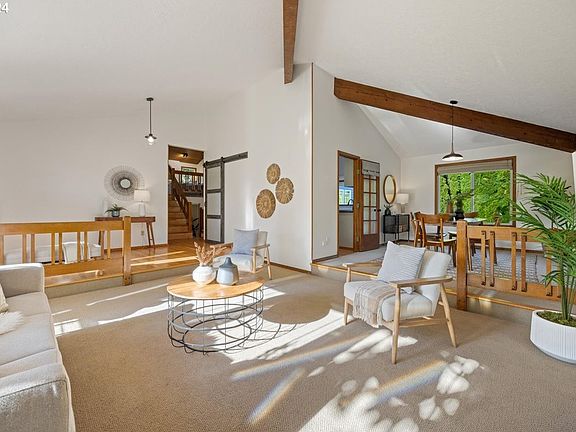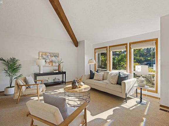 Mid century style in a modern package. This home has beautiful lines throughout and great outdoor spaces from the sunroom to the deck and large back patio and private yard. So many eye-catching interior features from the exposed beams to the wood accent walls and ceilings. Walk down the path to enjoy the amenities of the coveted Oak Hills community. Updated appliances include dishwasher, double oven with left opening doors and top oven with air fryer, and Matte Black fridge. Plenty of storage in the large garage as well as the outside shed and bonus storage under the sunroom. Sitting on a quiet cul de sac, this home is fantastically located just minutes from Bethany Village shopping and a quick drive to Nike, Intel, and great schools and parks and has no HOA dues.