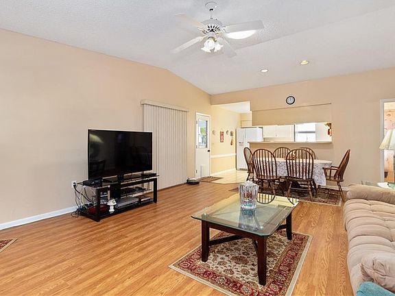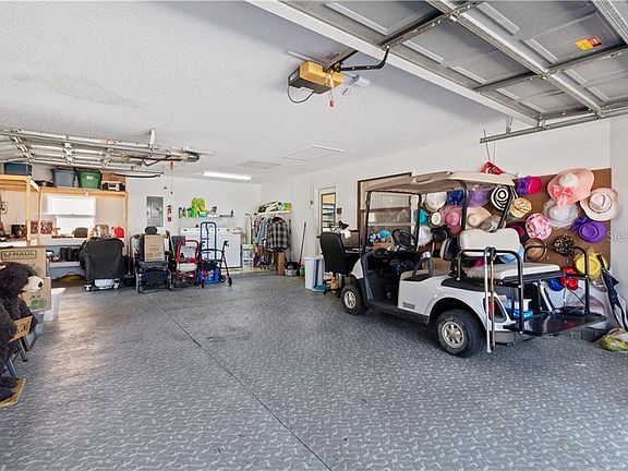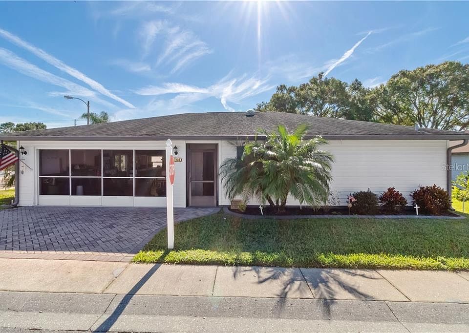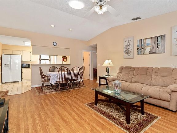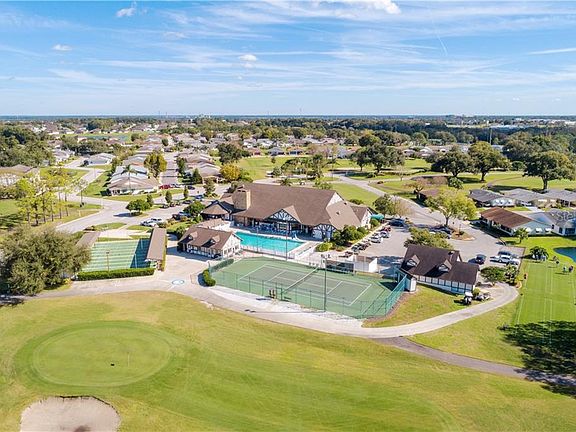 55+ Golf Community: If you are looking for a special home in a special neighborhood you have found it. Welcome to a low maintenance lifestyle.This cute 2 bedroom 2 bath home sits on a corner lot and is move in ready. This practical floor plan offers vaulted ceilings in the living /dining room combination area. The attached quaint kitchen keeps you a part of the action. Both bedroom are spacious and full of natural light. You will love the paved driveway and 14 x 13 paved outdoor living area that is complete with electric retractable awning. The screened extra long two car garage with decorative concrete floor provides a space to park your car and your golf cart all while allowing for a work bench space. No need to mow your lawn because the community handles that for you! Enjoy the Florida lifestyle with your own lemon and orange tree. Head over to the community pool, shuffle board court, fitness room, community center complete with kitchen, or head out to the golf course for 18 holes. Enjoy the community's social calendar, get to know your neighbor, and attend monthly activities. This is a tight knit community. You are just a quick drive to the attractions in Orlando or Tampa! THIS HOME COMES FURNISHED so don't forget to ask which furnishings stay!!