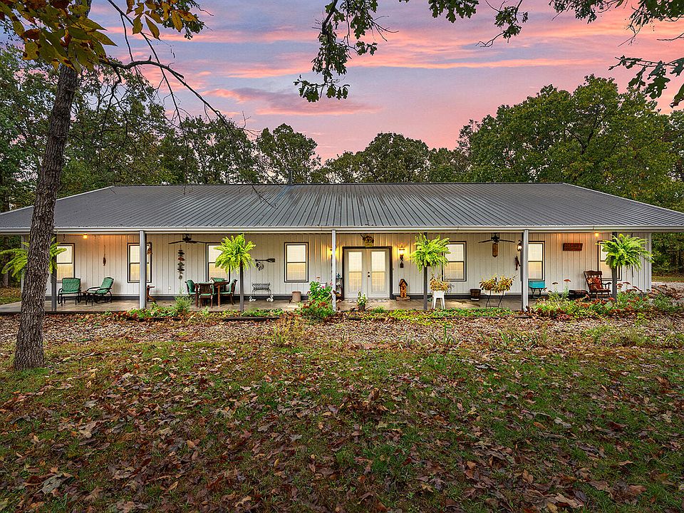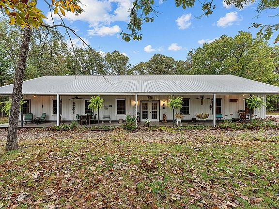 Welcome to the ultimate rural retreat! This stunning & incredibly well maintained 3,200 sq ft home sits on 10.5 acres, offering the perfect blend of comfortable living, serious hobby space, and incredible outdoor utility. Inside the home it offers unrivaled space and 13' ceilings! Dual zone HVAC and NEW Pellet stove. The primary suite is extremely spacious and has a sunroom attached that has been used as a sewing room but could be used for about anything. The front and rear of the home have covered porches going the full length of the home. The home was built to last with slab foundation, metal roof, and metal siding. The attic space is HUGE, fully floored and sheet rocked. Moving outside there is a picturesque 14' x 22' Greenhouse with running water, and electric. Also on the property is a fully insulated 30'x50' shop that includes concrete floors, 220 power, wood stove, and forge. Exiting the shop, you'll notice the pond down the hill. Moving onto the last structure on the property it has been used as a dog run/house but would also make an incredible chicken coop! All of this is located just over a mile from the boat ramp on the pristine Pomme de Terre Lake. This property is an outdoor lover's paradise!