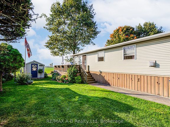 Welcome to this beautifully upgraded home in the highly desirable Happy Hills Retirement Community, perfectly situated with a private backyard overlooking open farmland. This open-concept residence features gleaming hardwood floors and a spacious kitchen with ample cabinetry. With approximately 1400 square feet of living space this lovely property offers 2 bedrooms plus a bright sunroom, 1.5 bathrooms (fully renovated 4 years ago), the home is designed for comfort and functionality. With Quadro fibre optics, you can enjoy seamless streaming or enjoy outdoor living on the private back deck, complete with hot tub hookup. This home also offers generous storage space beneath the home and in the shed complete with hydro hookup. Happy Hills offers resort-style amenities, including controlled gate entry, a recreation hall, indoor heated pool, and golf facilities, providing a vibrant and secure lifestyle. Note with owning a property in the retirement all year living side, you have full access to the facilities on the camp ground side during the camping season, which is ideal for your grand children. The sellers will be installing a new roof in October 2025- which is an added bonus. Don't miss your chance to own in one of the most sought-after locations in the park. Call for your private viewing today.