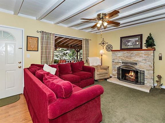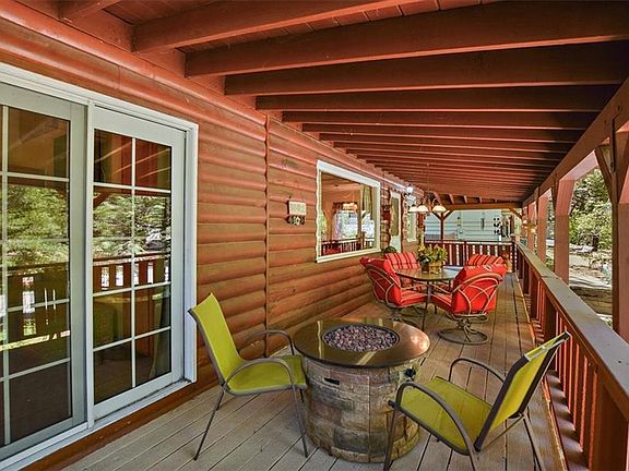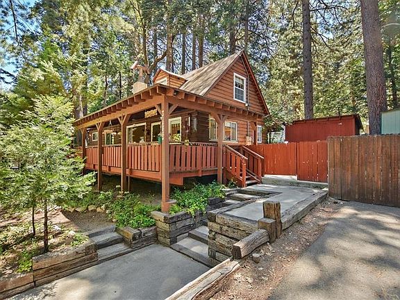 This 1168 sq ft log style cabin comes fully furnished & ready for you to move right in! 3 bed, 2 bath home is on a mostly level 6400 sq ft lot. A large front covered deck w/firepit & sitting area greets you as you walk up to this cute cabin.Enter into the open floorplan from the front deck & to the spacious beamed ceiling family room w/gas fireplace & picture window.Off family room is a dining area adjacent to kitchen which has a breakfast bar, gas range, refrigerator, microwave & new dishwasher. There is a downstairs primary bedroom with large walk-in closet with mirrored doors & a bathroom with walk-in shower & skylight.A second full bath off the family room has a walk-in shower. Two additional bedrooms upstairs.A back door from the kitchen leads to rear porch & entry to the separate laundry room.The side & back yard is fully fenced.The backyard has a large shed which comes complete with tools & new snow blower.Ceiling fans in 3 bedrooms&family room.View virtual tour & 3D floor plan!