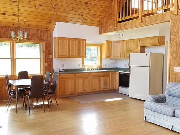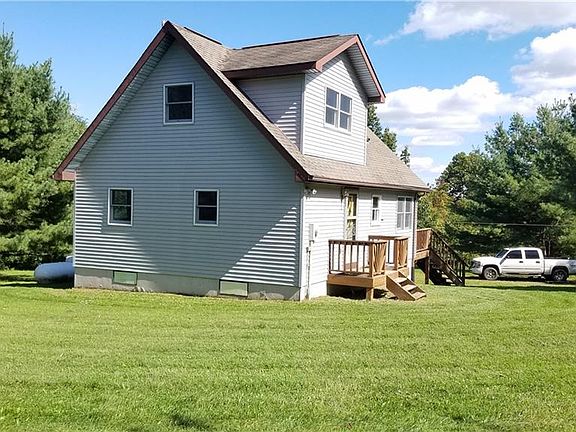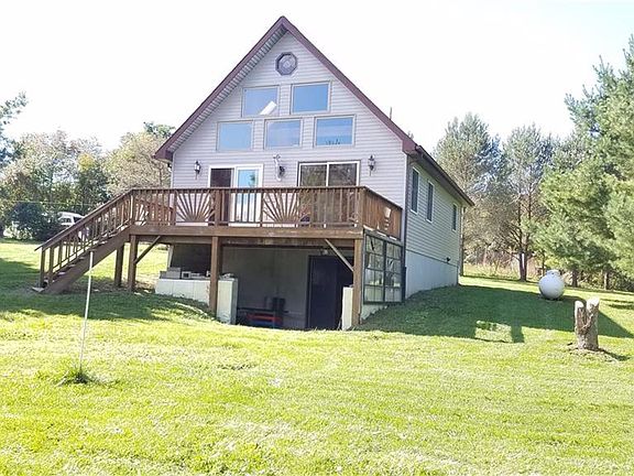 Modern chalet style home on a full walk-out basement, tucked back off the road on a partially wooded and open 17+ acre parcel (estimated at 17.5 acres, to be surveyed). 50' x 38' Shop with large front door that was designed to fit an airplane (has electric, stone floor). Nestled just north west of Keuka Lake/Branchport. Give/Take 5 minutes to launching your boat and the Keuka Lake State Park. On a town Maintained Road with well over 700/800' of Road Frontage. Knotty pine, vaulted ceilings throughout. Large front windows, large full front deck. 1st floor bedroom & full bathroom, plus a loft bedroom and half bath upstairs. Generator panel connection in place. 1st flr laundry hook ups (currently hooked up in basement). Newer Anderson Windows. Newer water heater. Priced to sell!