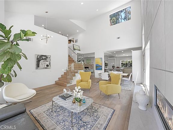 Thoughtfully renovated from top to bottom, this home now features wide-plank hardwood floors throughout, a bold staircase redesign with glass sidewalls that replace the heavy stucco, opening up the space with clean lines and allowing sunlight to flood the interior with natural light. The kitchen is fully remodeled, creating a chef's dream. Enjoy a brand-new oversized island, custom cabinetry, designer stone countertops, built-in refrigerator, wine storage, and top-tier appliances. Accordion-style glass doors create a seamless indoor-outdoor flow to the re-landscaped backyard, now featuring a seating area, updated planting, and decomposed granite, perfect for California entertaining.