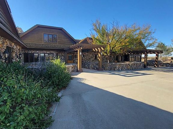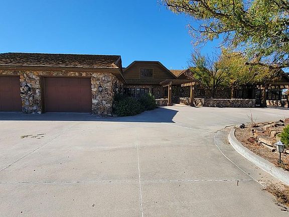 The home is one-of-a-kind. A sprawling 6,582 sf home was well constructed back in the 1990's and finished to the 9's with custom oak cabinetry and solid surface countertops throughout the home, brass finished faucets, walk-in showers in each bathroom just to get started. Each bedroom has a full on-suite bathroom and walk-in closet space. The living room is finished with a fiery brown/red rock with white veins reminiscent of the Hereford cattle color and in the center a wood burning fireplace. The dining room offers extended space with a 23'x27' floor area. Just off the first-floor bedroom suite is a 13'x19' spa room with an in-ground hot tub. The primary bedroom has a grand stairway on one end and a spiral stairway on the other. The primary bedroom is a stunning 30'x43' space with views of the countryside as well as a bar area, built-in oak cabinetry and wood burning fireplace. The exterior of the home is uniquely finished with a rock exterior. The main entry has massive trellises leading to the main entrance that opens to a marble floor foyer. Fantastic entry! The home was once elegantly landscaped with remaining large boulders, knee-high rock walls, sprinkler systems and statue placements. There are two front entrances with trellis structures and petrified wood, lighted planters for spring/summertime beauty. This home is fantastic in design, will require carpeting in many places. For the price, this is one you cannot pass-up!
