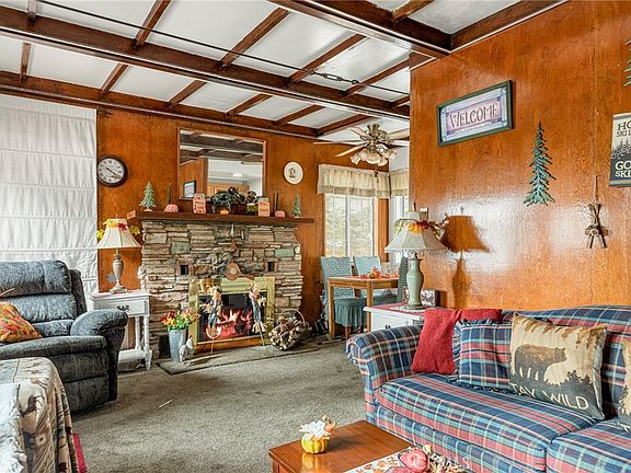 Accepting back up offers. This adorable 1943 cottage is nestled on a large lot surrounded by pine, spruce, dogwood, and redbud trees. Cherish those cool summer nights on the front deck under the pines before entering the home. Step into the living room featuring a rock fireplace, pine paneling and coffer ceilings giving you that vintage feel. Dining is open to the living room. The kitchen has oak cabinets, tile countertop, built in microwave, fridge, and stove. Bedroom one has ceiling fan, the original pine paneling & door. Bedroom two is located off living room. Three-quarter bathroom off of hallway. This cozy cabin is all on one level with a newer roof and dual pane windows throughout. Laundry room with 4-year-old washer-dryer of kitchen and back door access to three-quarter fenced yard. An adorable shed is in the back yard with a brick path to the house. Conveniently located to Highway 18 and minutes from Snow Valley Ski Resort, hiking trails and so much more!