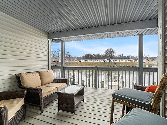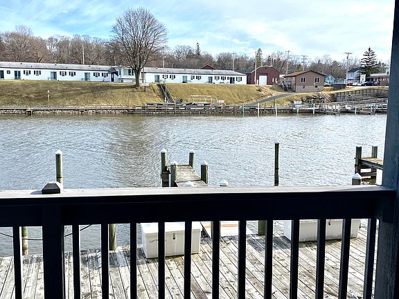 Begin your New Year with a Fully furnished WATERFRONT Condo. & BOAT SLIP on the Manistee River. Located less than 1 mile to LAKE MICHIGAN beach and downtown Manistee. This 2 bedroom, 1 bath condo. has been updated with fresh paint, crown molding throughout and has lovely waterfront views! The boat slip is just outside the door. Home has an open floorplan with water views from master bedroom and living/dining/kitchen. The kitchen has a large garden window for plants or an herb garden. Relax by the gas fireplace in the cozy living room ,or enjoy time entertaining on the deck while watching sailboats, fishing boats and freighters as they travel to Lake Michigan. Condo comes with a carport and storage space. Community swimming pool is only steps away. Call agent to view today!