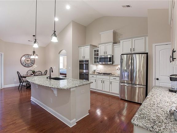 Pristine Home on cul-de-sac lot in desirable Lake Ridge Community in Tega Cay. This move in ready home provides beautiful interior features and upgrades that include archways, crown molding, hardwood floors, private office or study with glass panel French doors and bay window, formal dining room, open to family room with vaulted ceiling and fireplace, luxury kitchen with informal dining area, large island, granite countertops, stainless steel appliances, double ovens, and gas cooktop. Owner’s suite includes sitting room, custom walk-in closet, and master bath with separate tub, dual sinks with granite countertop, and tiled shower with built-in bench. On the opposite side are two bedrooms, bath with double-sink granite countertop, and laundry room with custom cabinets. Two-car garage features ceiling-mounted storage racks and attic floored storage above garage. Enjoy serene outdoor living with private “tree house” view of woods from screened porch and paver patio with fire pit.