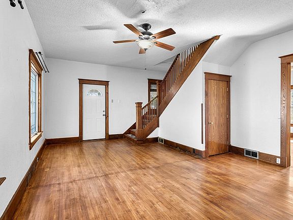 Conveniently located, spacious, move-in ready home with meaningful updates including refinished hardwood and slate tile floors, remodeled kitchen, refreshed upper bath with tile walk in shower, and two pellet stoves. Main level flows for everyday living and entertaining; upstairs offers four spacious bedrooms with walk-ins. A fenced yard with poured-concrete patio extends your living space; the 2-car detached garage, extra poured parking pad and full dry basement handle tools, toys and storage. Classic 1889 construction characteristics, 3,300+ sq ft, and a convenient in-town setting minutes from shopping, dining, lakes and trails. Some Photos Virtually Staged