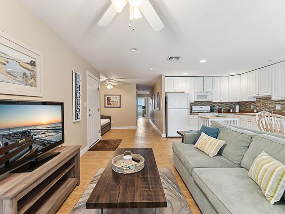 This stunning top-floor, 3-bedroom, 2-bathroom condo is the perfect coastal getaway, ideally located just steps from the beach, boardwalk, and popular restaurants. Designed with an open and airy floor plan, the interior is bright and cheery, featuring low-maintenance wood-look tile flooring in the main living areas and plush wall-to-wall carpeting in the bedrooms. The private deck is perfect for relaxing or entertaining, while the common area offers a sparkling pool, patio spaces with grills, and a convenient outdoor shower. Inside, you'll find a fully furnished, tastefully decorated space that includes a dedicated laundry room for added convenience. Additional features include a storage room in the garage and parking for two vehicles—one in the private garage and one in the driveway. With a condo fee that covers insurance, common area maintenance, and trash, this low-maintenance property is ready to be enjoyed year-round or as a hassle-free vacation retreat. Call today to schedule a private showing!