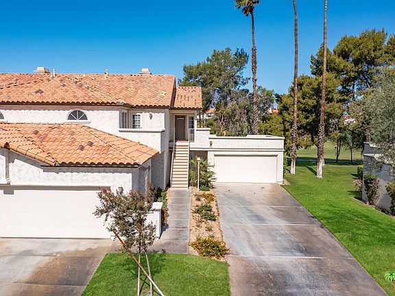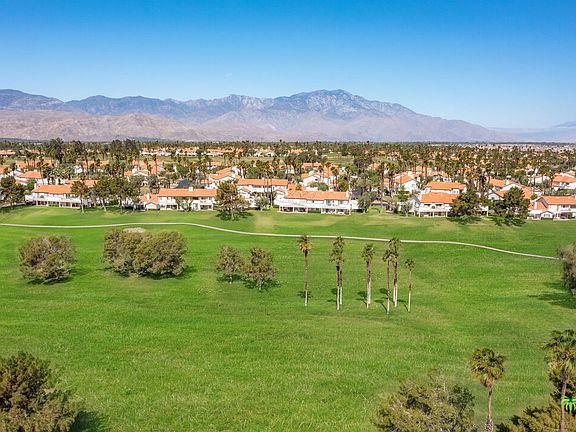 Location, location, location! This beautiful upper-level 2 bedroom, 2 bath villa has spectacular views from almost every room! Cathedral ceilings give the sense of a light bright open living area with 20 inch variegated concrete tile flooring through-out the freshly painted main living space, kitchen, bathrooms, and plush carpeting in the bedrooms. The living room, endowed with a cozy gas fireplace, and the main bedroom share the back patio that overlooks the 13th fairway with stunning views of the double fairway and the San Jacinto Mountains as a western backdrop. The kitchen has its own private eastern facing patio, perfect for enjoying your morning coffee and breakfast. Included with this unit, is your own spacious 2 car garage. HOA dues include fitness, tennis, pickle ball, bocce ball, horse shoes, ladder toss, plus cable TV. There are 9 tennis courts, 25 community pools and spas, and the clubhouse and dining are first-class! Along with being listed as one of the top ten courses by the SCPGA, the links golf course is one of the top championship courses in the valley and has been given 4 stars by Golf Digest as One of the Best Places to Play! This unit is ready to be your new home in paradise!