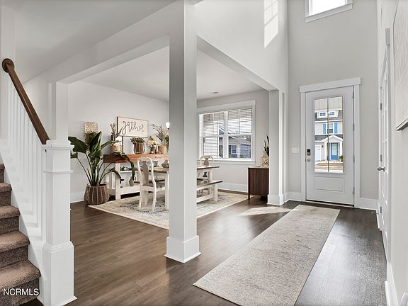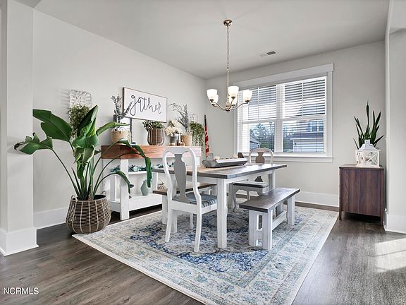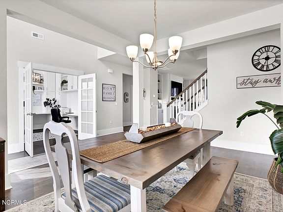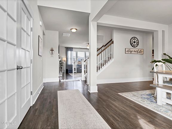 This gorgeous home has upgrades at every turn! There is space for everyone with 5 bedrooms, 4 bathrooms, a bonus room and an office. The large foyer opens to a formal dining room and a home office designed with custom built-ins straight from your Pinterest inspiration board. The kitchen, with a 5'x9' granite island overlooks the family room that showcases custom built-ins and a gas log fireplace. A bedroom and full bath, perfect for guests, complete the first level. Upstairs you will find a large bonus room, the primary bedroom with a generous walk-in closet and 3 additional bedrooms to use as you see fit. The screened in back porch overlooks the newly built firepit and patio. The fenced in backyard includes raised flower beds that are ready for your personal touch. Beyond your fence is a large common area that adds a nice buffer between neighbors. Fill your glass straight from the tap, as this home also has a whole house water filtration system. The solar panels will save on your electric bill and will transfer ownership at closing. The Waterside Community is loaded with amenities and within walking distance to local restaurants, shopping, and the Surf City Bridge! Amenities include a community swimming pool, clubhouse, fire pit, playground, multi-sport court (pickleball, tennis and basketball) and a sand volleyball court. Schedule a showing today and get ready to start living that coastal lifestyle.