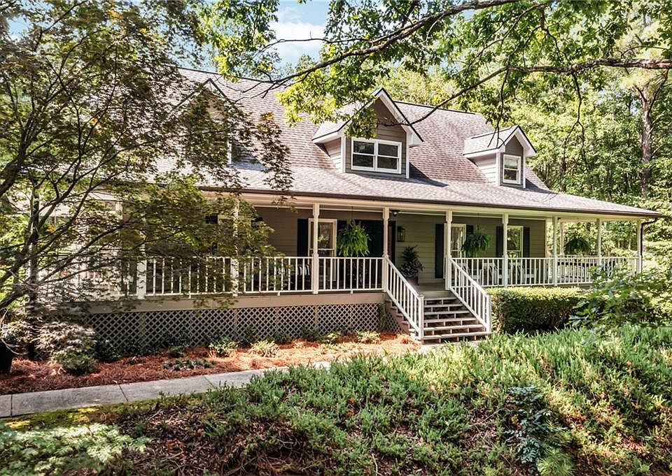 Set on two private acres, this thoughtfully designed home welcomes you with a classic wrap-around porch. With 3 bedrooms and 3.5 baths, each space showcases designer touches that elevate everyday living. The main level features hardwood floors, shiplap accents, custom oak built-ins, and elegant mouldings. The living room boasts a soaring cathedral ceiling open to the upper level and a cozy sun porch with views of the fenced backyard. The kitchen offers stone countertops, double pantries, and a bright breakfast nook that flows into an oversized dining room. The main-level primary suite includes a walk-in closet and a spacious bathroom with double vanities and a jetted tub. Upstairs, two secondary bedrooms share a large flex space filled with natural light and views of the manicured yard. The finished lower level offers a media room with a projector screen and theater seating. You will also find a full bathroom, ample storage, and two versatile bonus rooms with their own entry, ideal for a home office, gym, or creative space. Outdoors, enjoy raised garden beds, fruit trees, and a detached 2-car garage with a dedicated workspace. Additional features include RV or boat parking and an electric car charger. The architectural shingle roof is only 6 years old. With no HOA and a prime location just minutes from shopping, dining, LakePoint Park, Lake Allatoona, and I-75, this home truly offers it all.