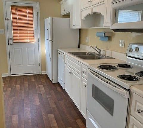 Upon entry this home opens up to a large main living room with combined dining space with vaulted ceiling. The dining space leads to the kitchen and eat in breakfast area. Fresh white cabinets, matching appliances, and built in cabinet / buffet for extra storage space! Spacious Owner suite and large walk in closet. The Owner bathroom features a large vanity and shower/tub combo. The second bedroom is located up front off the living room and has great closet storage and access to the second full bathroom with shower/tub combo. The backyard is fenced in with large patio area. This townhome is in the heart of Evans, close to tons of shopping and restaurants!