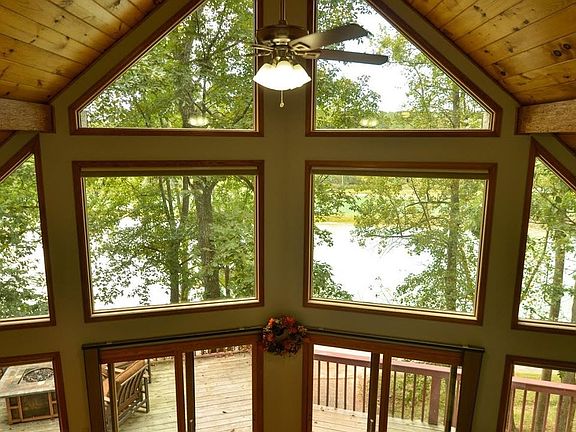 Beautiful home ON THE LAKE with awesome lake views nestled on 1.24 ac in the Mountains of a Private Competition Waterski Community. The home offers large great rm with soaring cathedral ceiling, floor to ceiling windows, wood burning FP, open dining area, open kitchen with Corian counters and custom hickory cabinetry, and Whole House Bose Surround Sound. The sun porch offers an additional 324 sq ft. Upstairs master suite with awesome barn door window opens for fabulous views of lake and closes for privacy. Finished terrace level with lg family rm, full bath with heat lamps, additional rm which could be 4th bedroom, and oversized 2 car garage with workshop. Low maintenance vinyl siding looks like wood, low maintenance landscaping, oversized decks with fire pit feature, two private waterski lakes and the community offers use of ski boats for property owners to enjoy and lake hut for get togethers. SIP.
