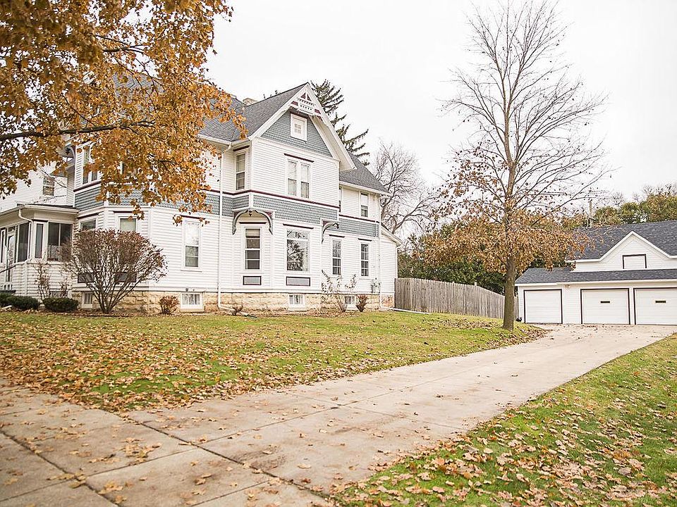 FANTASTIC OPPORTUNITY! Well kept property shows pride of ownership that comes from decades of being an owner- occupied duplex. First floor features 2 bedrooms with the possibility of a 3rd, updated kitchen, large living room with antique fireplace, high ceilings, hardwood floors, lots of natural light. Upstairs is another 2 bedroom unit with an office/study, efficient kitchen, gleaming hardwood floors. Three season front porch with beautiful natural wood floors and ceiling. Rear porch and fenced yard with concrete patio. The 3 car detached garage and newer concrete drive complete this property. Each unit has an in-unit laundry. Both the home and garage have large walk up attics for additional storage. Enjoy the benefits of owning your own with the extra income to help pay the mortgage!!