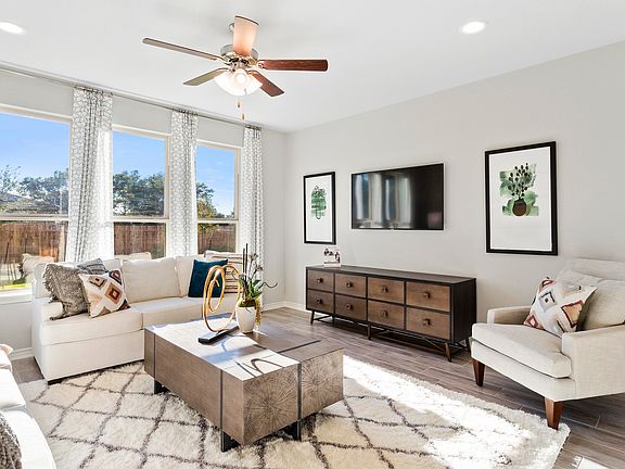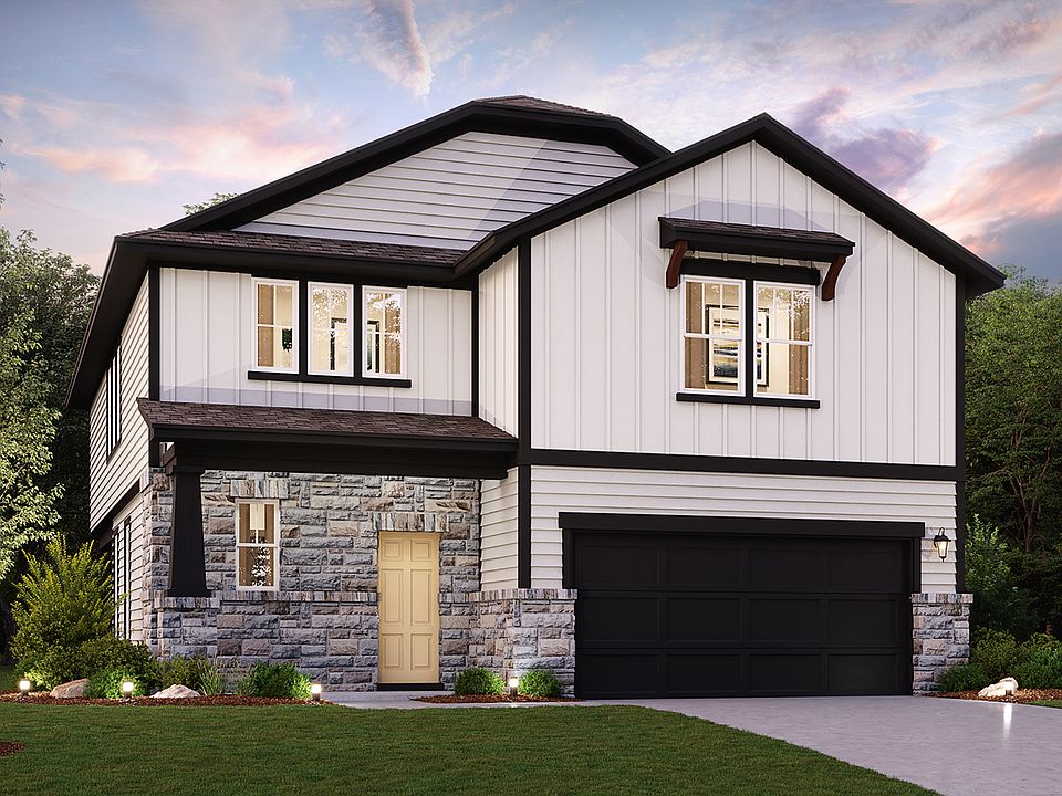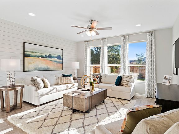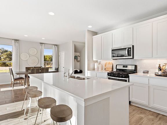 2-Story; 4 Bedrooms, 3 Bathroom, 2-Bay garage. Game room upstairs. Kitchen features 42" white painted cabinets, white quartz counter tops, subway tile backsplash, center island and corner pantry. Stainless-steel refrigerator and top-load washer/dryer set. 2" white faux wood blinds throughout. Covered patio. Other upgrades include: Utility and mud room built-ins, Platinum electrical package, walk-in shower and dual sinks at the vanity in the primary bath, extended wood-look tile throughout common areas on first floor and more. Redbud Plan, elevation B