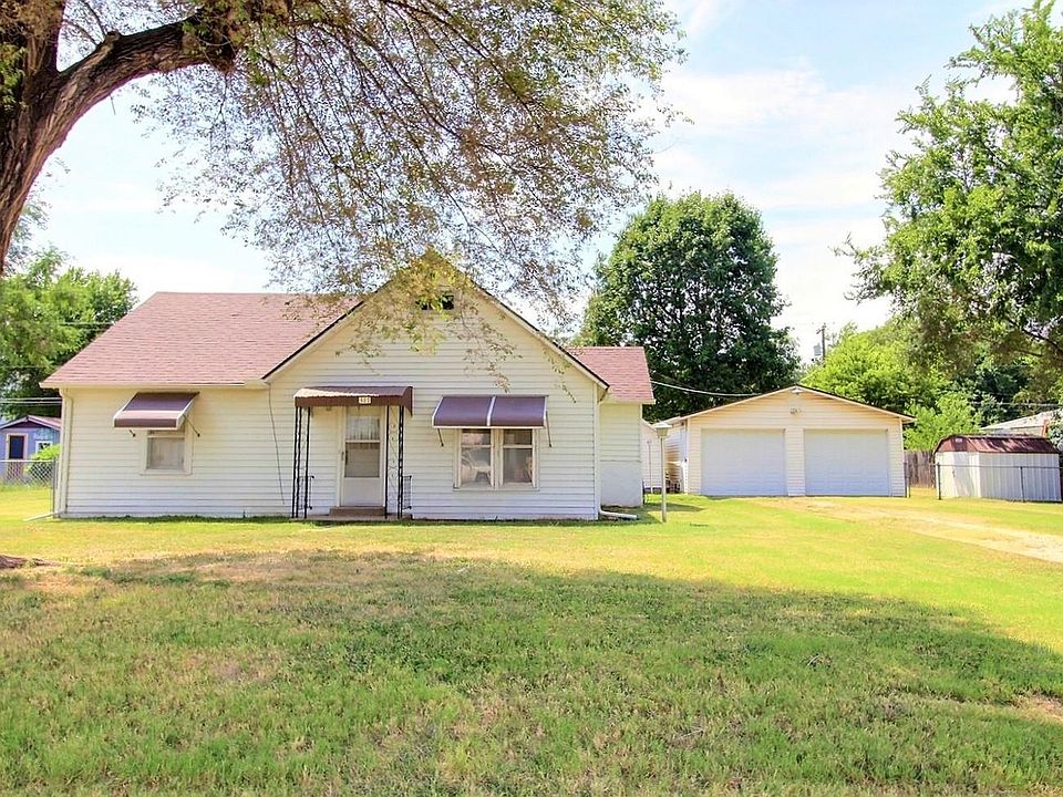 Welcome Home to Sedgwick, KS and step inside this quaint 2 Bedroom, 1 Bath home with a 2 Car, Oversized, Detached Garage on two lots totaling 1/3 acre. This home has been loved for five generations of the same family for the better part of the past century, and they are ready to pass the torch to someone that will breathe new life and love into it for years to come. It is located across the street from the Sedgwick Fire Dept. and to the east, the railroad passes a few times a day, but otherwise, it is a quiet area. As you can see from the pictures, there is a large fenced yard which does have a well that you can hook a hose to in order to keep your yard green and gardens growing in this Kansas weather! You will find the large, covered patio out back will give you shade year round. Inside the home, all window coverings and appliances - Disposal, Oven/Stove, Refrigerator and stacked Washer and Dryer - will stay. The wall heater keeps it nice and toasty in the winter, and window A/C keeps it cool in the summer! The sizeable dining room and large living room give you plenty of space for entertaining and relaxation. There may be original hardwood floors under the carpet, but seller is not certain. While the bedrooms and bathroom side of the home are not part of the original house footprint, they were added many years ago, almost doubling the square footage inside. The original wash house outside was converted to storage when washer and dryer were moved inside. There is also an outside storm cellar and an 8'x10' shed too. This house is selling as-is, where-is, ready for someone to give it a little TLC to make it shine once again, so schedule your showing today! Sellers are having a garage sale during Sedgwick City Wide Garage Sale July 29th & 30th, so the home is prepped for that and the home will be open during the sale as well.