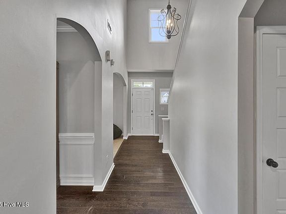 Looking for a move in ready home in a convenient location? Well...here it is! This home offers 4 bedrooms 2.5 bathrooms and is located in the desirable community Village At Folkstone. As you walk through the front door you will notice the tall 2 story foyer & wood floors that flow from the foyer all the way into the formal dining room & kitchen! Upon entering to the right is flex room, which makes a great office, den or play area for little ones. The formal dining room is next and can accommodate a large table for family gatherings and features an upgraded coffered ceiling. Make your way to the kitchen and you will find a chef's dream. This kitchen is the perfect space for entertaining and comes well equipped with granite counter tops, stainless steel appliances, plenty of cabinet & counter space, a pantry and a raised bar. There is a casual breakfast nook between the kitchen and spacious family room. In the family room you will find a gas log fireplace and lots of windows for natural lighting that look into the partially wooded and fully fenced back yard. Walk up stairs and you are greeted by an open loft area. The owners suite has tons of room to offer, beautiful vaulted tray ceiling and a 10X12 sitting area. The ensuite bathroom has dual vanities, a large soaking tub, separate shower, linen closet and a HUGE walk in closet. There are three additional bedrooms all generous in size with tall vaulted ceilings and spacious closets. A full bathroom and laundry room complete this 2nd floor of this lovely home. Enjoy a large fenced in back yard with just enough trees that allow you a large yard & to enjoy privacy all year long. This home comes freshly painted (3/1/ 25), includes all kitchen & laundry appliances and a one year home warranty! Village at Folkstone is located less than a 1/2 mile off of highway 17 making Wilmington, Jacksonville, Camp LeJenuse, Stone Bay and Topsail Island commutes short & sweet. Schedule your private tour before this one is gone.