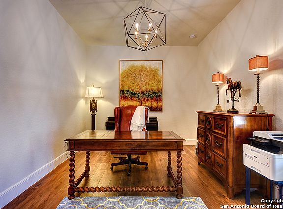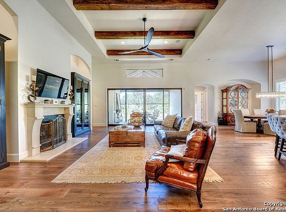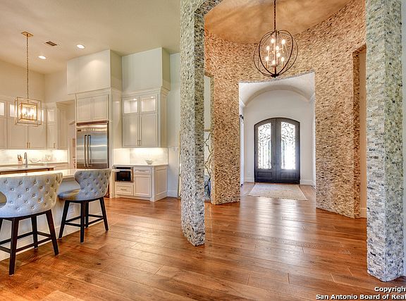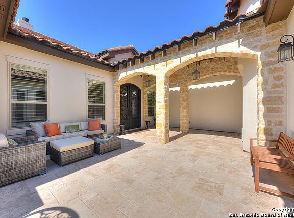 Stunning custom home in highly desirable gated Stone Creek Ranch. Enter private Courtyard to Double Metal-Glass doors that lead into stoned covered Chic foyer. Home is loaded w/ high end features including custom cabinets, a true GOURMET kitchen w/ high end appliances, open floor plan, granite counters, gorgeous island, wine area, amazing master suite, covered porch w/ outdoor fireplace and remote screen. 4 beds, 4 baths, HUGE yard w/ plenty of room for pool, sports court, Award-Winning Boerne ISD schools