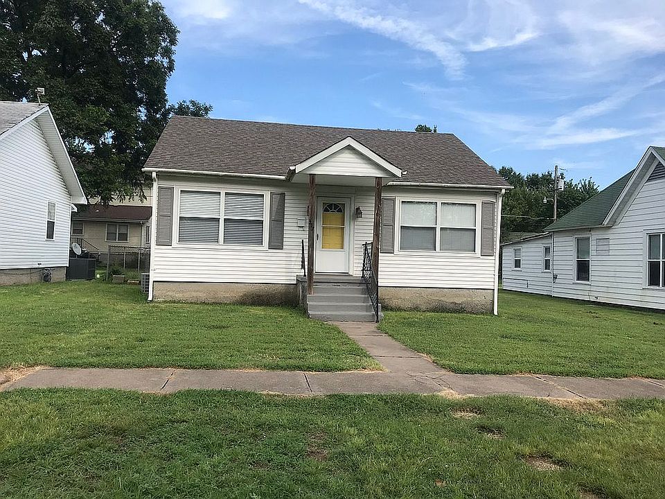 Cute 2 bedroom, 1 bath with small fenced yard, large concrete patio, detached garage, updated electrical, tiled kitchen and bath, small laundry room, central (gas) heat and central electric AC. Black newer refrigerator and gas stove. Built in dishwasher. Nice neighborhood in small town with awesome schools.