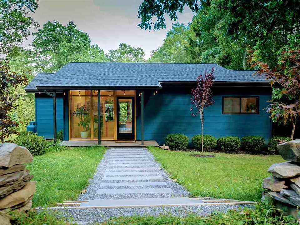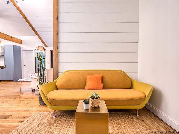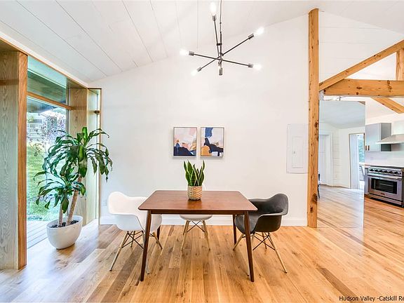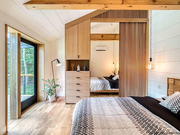 Completely reimagined and renovated by two Brooklyn creatives, this Olivebridge, NY cottage is a stunner. Originally built in 1940, this 2 bedroom home has been transformed for living in the 2021 with an open floor plan, vaulted ceilings, floor to ceiling windows, and wood flooring in every room. The custom oak millwork throughout this home is absolutely gorgeous! In the bedrooms, bespoke floor to ceiling storage maximizes the space so there's no need for furniture. With built-in drawers, pull down hanging rods and built-in shoe racks, there's a place for everything. In the kitchen, you'll find more custom cabinetry and plenty of counter space to prep meals for family and friends. There's even a place for a washer and dryer neatly hidden in a cabinet. The bathroom features a large shower, cement tile and radiant heat floors for maximum comfort on chilly days. And those windows! Each room features floor to ceiling windows to capture the natural beauty outside. Sleek and modern, they're framed in beautiful oak wood that matches the woodwork throughout the home creating a flowing, cohesive space. There's a sweet covered back porch that's accessed via the main living area as well as one of the bedrooms - a perfect place for relaxing. Continue to the large backyard and you'll find a huge patio (17' x 24') with built-in seating ready for entertaining guests; there's even plenty of room to add a pool. Set on nearly an acre, on a quiet wooded road, this home brings a sense of peace and tranquility. Truly a one-of-a-kind find. A perfect location, 2hrs to NYC, rural but not isolated, wooded and quiet, with easy access to local amenities, nature and recreation. Close to Stone Ridge, High Falls, Kerhonkson, Arrowood and Westwind Orchards, Mohonk and Minnewaska Preserves. Schedule a showing today!