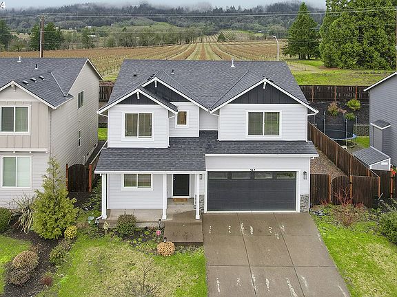 Beautiful 2019 home located in North Newberg in highly sought after neighborhood! Home has a covered front patio, 4 bedrooms + an office/den with double doors on the main level. Great room floorplan with engineered hardwoods throughout the main level, gourmet kitchen with slab granite countertops, tile backsplash, stainless steel appliances, gas range, eat bar and a large pantry. Large living area features gas fireplace. Spacious dining nook with slider to covered patio and fenced yard. Upper level features 4 bedrooms and laundry room with multiple cabinets storage. Large primary suite with vaulted ceiling, oversized walk-in closet, soaking tub, walk-in tile shower and double sinks. Air Conditioning. Convenient to parks, downtown Newberg & wine country!