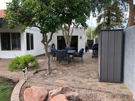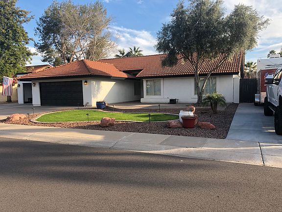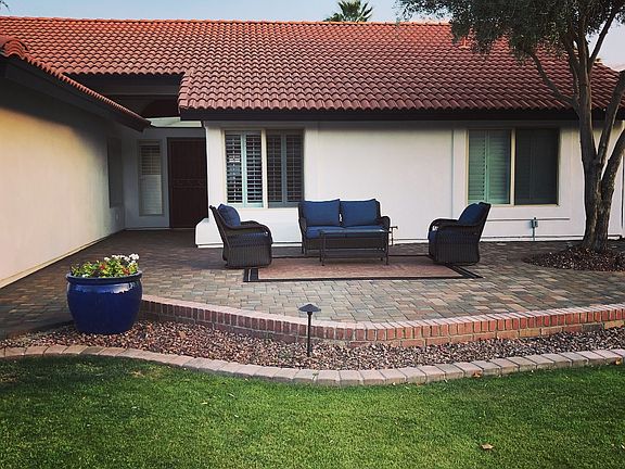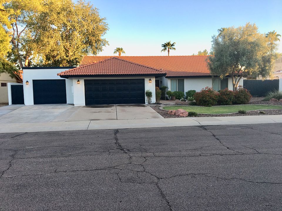 Beautifully updated, semi-custom home in popular New Horizons Neighborhood is warm, open & inviting. The home has recently had all new exterior smooth finish stucco with new two tone paint.Features: Vaulted ceilings, granite counters, all hard floors, lovely fans and fixtures, ample storage. Office/den has full closet & can be utilized as 3rd Bedroom. Large rear yard features: extended covered patio w/fan, TV hookup, built-in storage unit w/tiled accents & a refrigerator nook; over 1000 sq feet of paver patio out back surrounded by lush landscaping; grass area shaded by mature trees; & remodeled pebble-sheen pool w/baja shelf & new vari-speed pump. Got toys? Need a workshop? The 3 garage garage has epoxy floors and the Separate attached 14 wide by 26 foot deep 3rd car garage has doors with openers at both ends, led lighting and surround sound with flat screen tv. 3rd car garage also has stainless steel full size refrigerator as well as stainless steel commercial grade sink. Home has 40 foot concrete pad in front of rv gate as well as 40 feet of concrete pad behind gate. Extras: Water softener, RO, hot water circulator, new water heater, attic storage and more! Out front is a 1000 square foot paver patio as well as new Led landscape lighting with beautiful grass area.