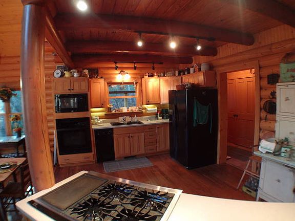 Beautiful log home on 3.85 private acres. 3 bedroom 3.5 baths home features hardwood & Tile floors, Corian Countertops, large stone wood burning fireplace. In the basement is a bonus/ rec room with a wood burning stove, full bath and workshop. Nice mountain views and property adjoins USFS. Lots of deck and porch space to enjoy the mountain views and nature. Excellent for entertaining with lower patio and hot tub area. Two car attached carport and a metal roof. Single level living with the Master on the main with a nice bay window. Nature lovers paradise!