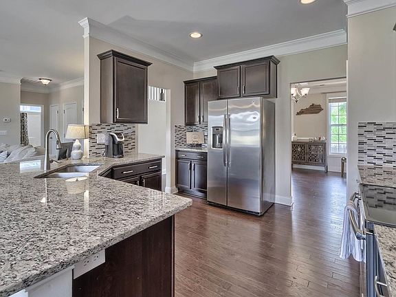 - Kitchen: Bar, Counter Tops-Granite, Eat In, Pantry, Floors-Hardwood, Cabinets-Stained, Backsplash-Tiled