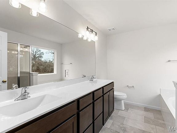 New McBride Homes Ashford 2 story 4BR, 2.5BA ready this summer! Partial walkout! Perfect for entertaining with open floorplan, 6’ windows & wood laminate flooring. Kitchen has center island w/breakfast bar, 42” Brellin White cabinets, quartz counters & GE stainless appliances. Breakfast rm w/sliding doors to backyard. Lg great rm w/ceiling fan. Formal living, dining,laundry & powder rms complete main level. Upstairs master suite w/walkin closet, lux bath w/double bowl vanity, walkin shower w/seat, & tub w/window. 3 extra bedrooms, each w/walkin closet & hall bath add convenience. ¾bath rough-in LL.Upgrades include 6 panel interior doors, lighting/plumbing fixtures, garage coachlights & more! Winding Bluffs Addition offers new homes in the Fenton area, minutes from Gravois Bluffs. Amenities include pickleball court, athletic field, dog park, trails, & community lake. Enjoy peace of mind with McBride Homes’ 10yr builders’ warranty & incredible customer service! Similar photos shown.