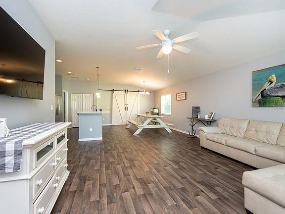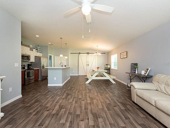 Enjoy Florida living at its best in this stunning 3 bedroom/2 bathroom home nestled on a cul de sac in Carpentras at the Villages of Avignons beautiful community! Warm and welcoming, this well-appointed single-story abode boasts plenty of living space and loads of upgrades such amazing wood laminate flooring throughout, vaulted ceiling in the open living/dining room and kitchen. The OPEN kitchen offers granite countertops, beautiful white cabinetry, stainless steel appliances, and a large island with seating. The kitchen overlooks the expansive combination living room/dining room which showcases beautiful views of the backyard, backing up to lush wooded wetlands. The glass sliders are behind the stunning barn doors give easy access to the screened in lanai which allows for an abundance of light to flow throughout. Pride in ownership is apparent in this meticulously well-maintained home! Truly a wonderful place to entertain family and friends! You will find the master bedroom is spacious and features a luxurious en-suite bath with enormous walk in shower. The secondary bedrooms are also bright, offers ample space. Carpentras at the Villages of Avignons offers its homeowners a wonderful family community with wetlands, walking trails, and a park. LOW HOA fees, NO CDD! Conveniently located close to fabulous Ellenton Premium Outlets, golf course, dining, and world famous Gulf beaches! Don't miss your chance to live in this gorgeous home!