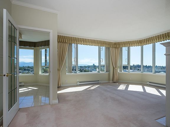 Spectacular SW corner suite with over 1900 sq ft. including solarium, all on one level! Unique and spacious floor plan. Rare 3 bedrooms plus den. Huge master bedroom with big W/I closet. 2 large full ensuites plus 1 full guest bath. Tall broad windows encompass 180 degree views from Mt Baker to the North Shore Mountains. Enjoy great sunsets! Other features include: 9 ft Ceilings, Gas F/P, Central A/C, B/I Vac system. Big storage locker & 2 Side X Side U/G parking stalls. Beautiful resort style high-rise has it all: 3 guest suites, RV parking, I/D pool, hot tub & sauna, billiards games rooms, loaded fitness room, lounging areas, workshop, hair salon, lots of beautiful manicured green spaces w/gazebo & O/D poolside patios. This lovely home awaits your personal touches.