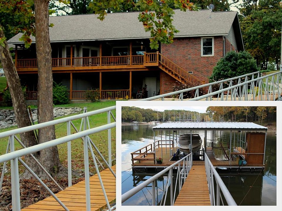 197 ft of Lakefront 4 or 5 bedrm., 3 bath Brick home with 2x6 ext. walls. Gentle slope down to the 2 slip covered boat dock with lifts. 3 car garage and basement has workshop & guest quarters. Cathedral ceilings and huge brick wood burning fireplace. Large yard and you own 1/2 the private boat launch. New 50 yr. roof 2011.All newly updated Inside & out and what a difference. You'll love this one!